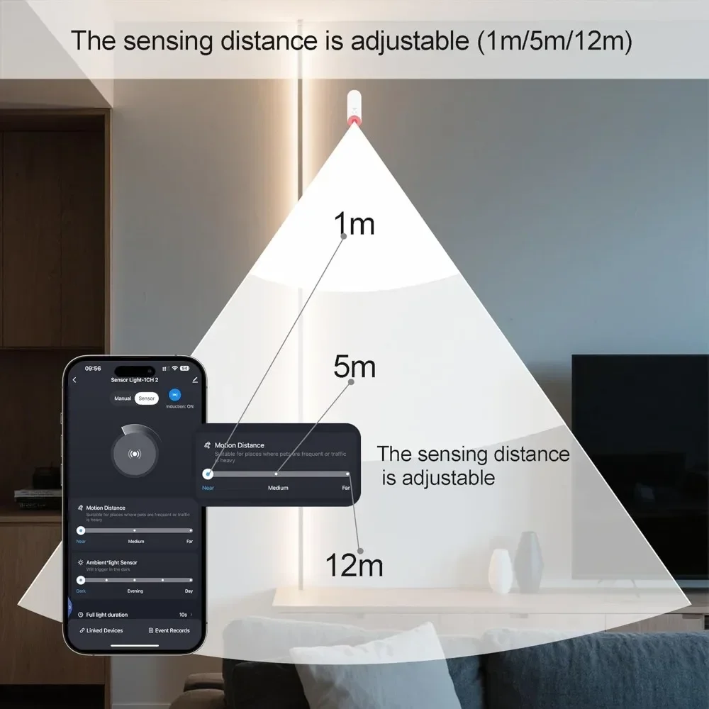 • The sensing distance, delay time, and light threshold can be set through the APP.