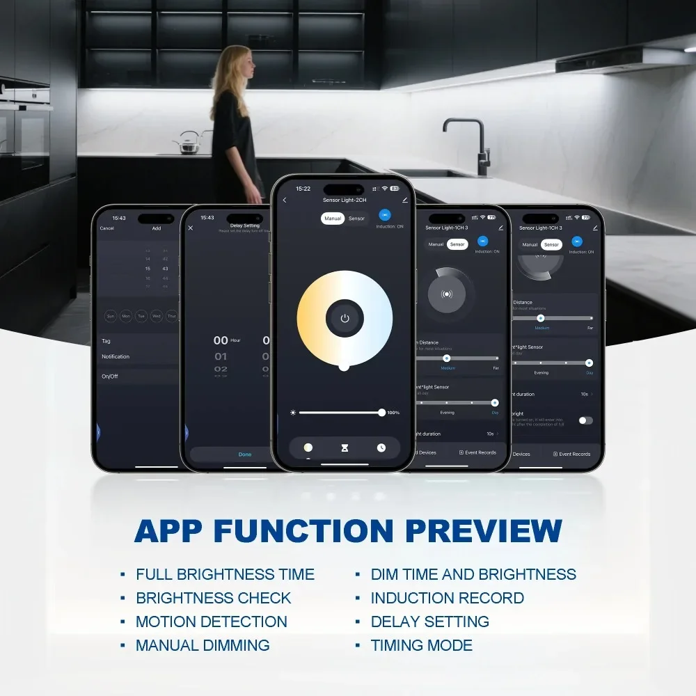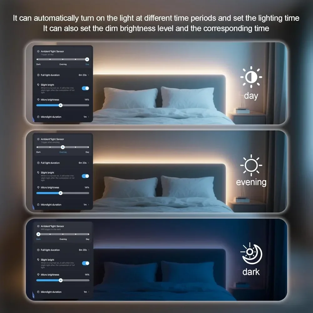 • Multiple sensing modes can be selected via the APP: the brightness of the sensing light is adjustable,
