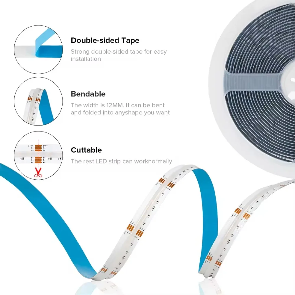 Dieser RGBCCT FCOB LED-Streifen bietet eine extrem gleichmäßige, durchgehende Lichtlinie ohne sichtbare LED-Punkte.